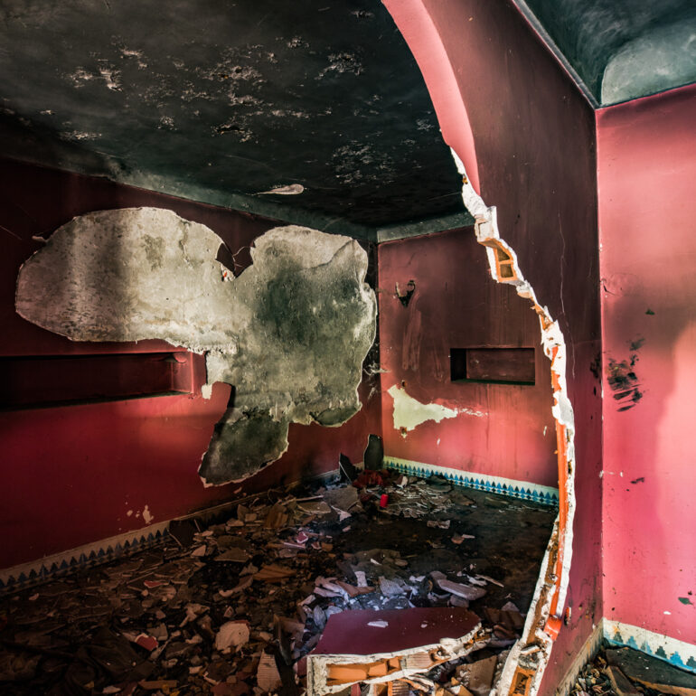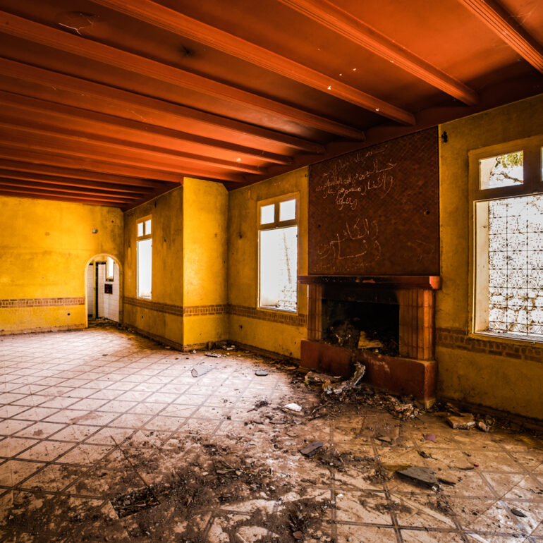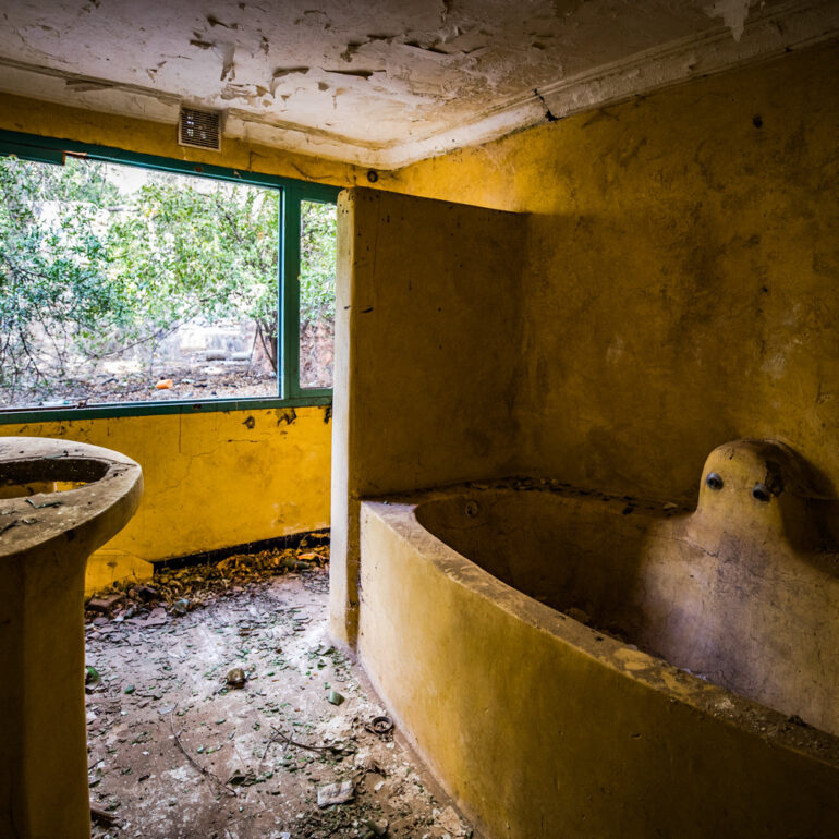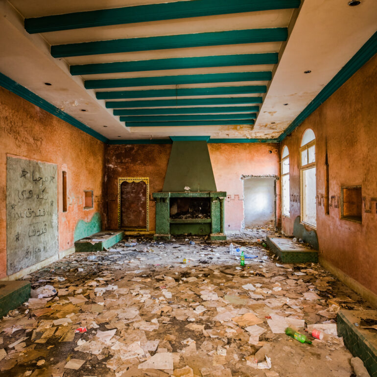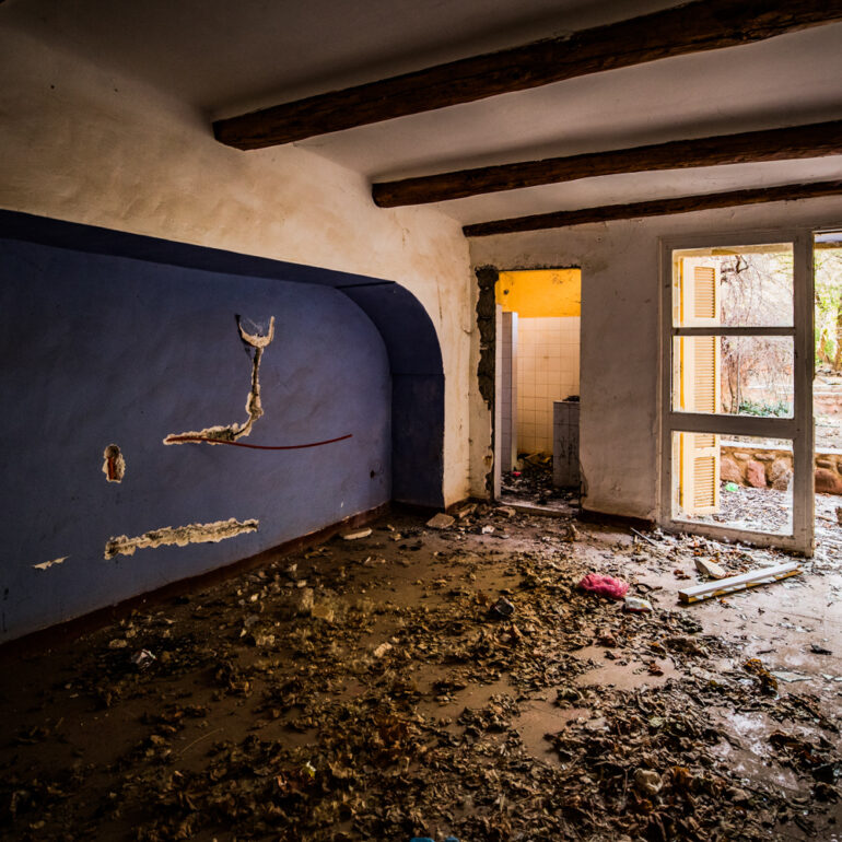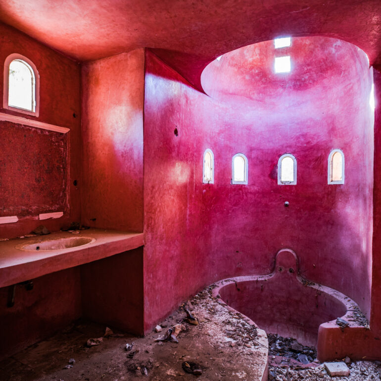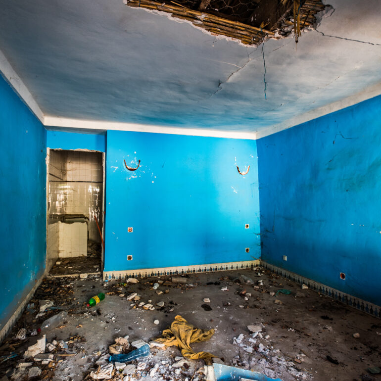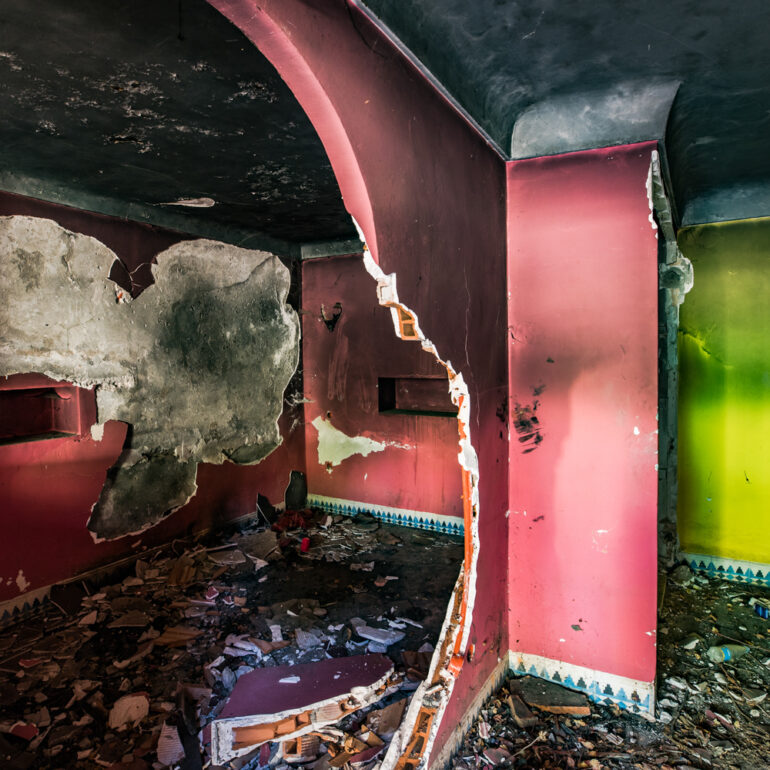 La série qui suit fait partie du projet «Lieux abandonnés» d’urbex, partant à la découverte du Sanglier qui fume, un ancien hôtel situé à 65 km de Marrakech. Le temps là-bas s’est arrêté, pour ne laisser régner que la nature qui reprend ses droits, sur l’ensemble de la vaste propriété, autrefois lieu de rencontre et d’hospitalité. La lumière du jour prend plaisir à éclairer encore ces grandes salles de réception et ces chambres aux salles de bain spacieuses, et à remplir si bien que mal cette piscine grande et profonde, asséchée depuis sûrement de nombreuses années. Le sentiment de reminiscence est omniprésent, avec aussi, une légère tristesse d’observer que l’homme a pu profiter de l’abandon du lieu pour amasser ce qu’il pouvait, des portes, des fenêtres, des câbles, de la robinetterie aux vasques… Seuls demeurent des papiers, par centaines, jonchant le sol comme après une tempête, et des vêtements et couvertures dans des recoins cachés, certainement ceux de vagabonds, trop pressés pour ramasser leurs maigres possessions avant de reprendre leur cavale.»