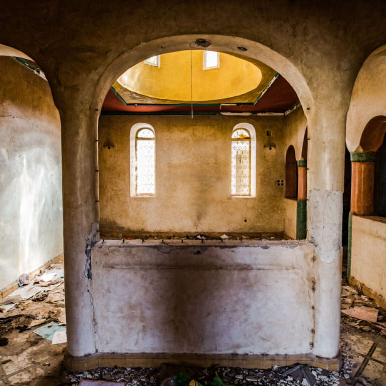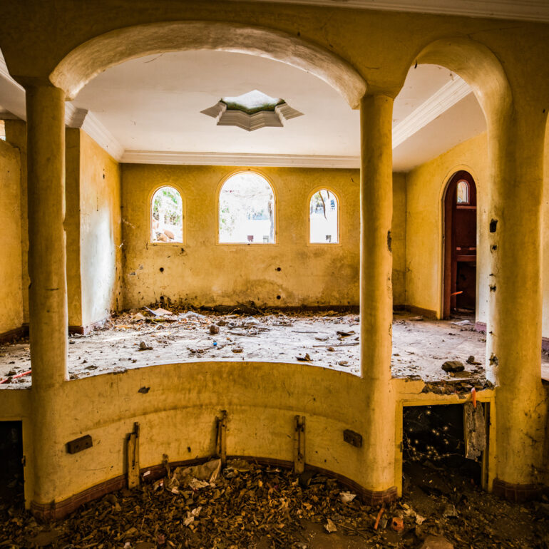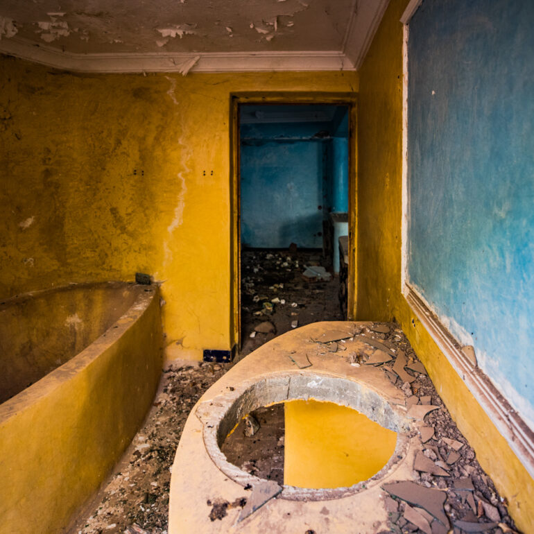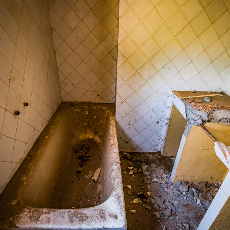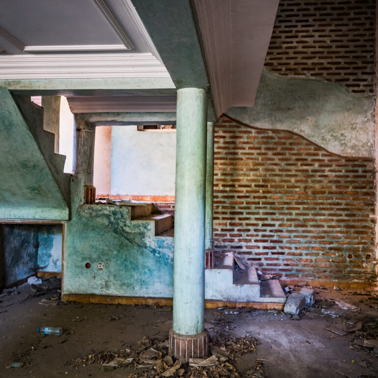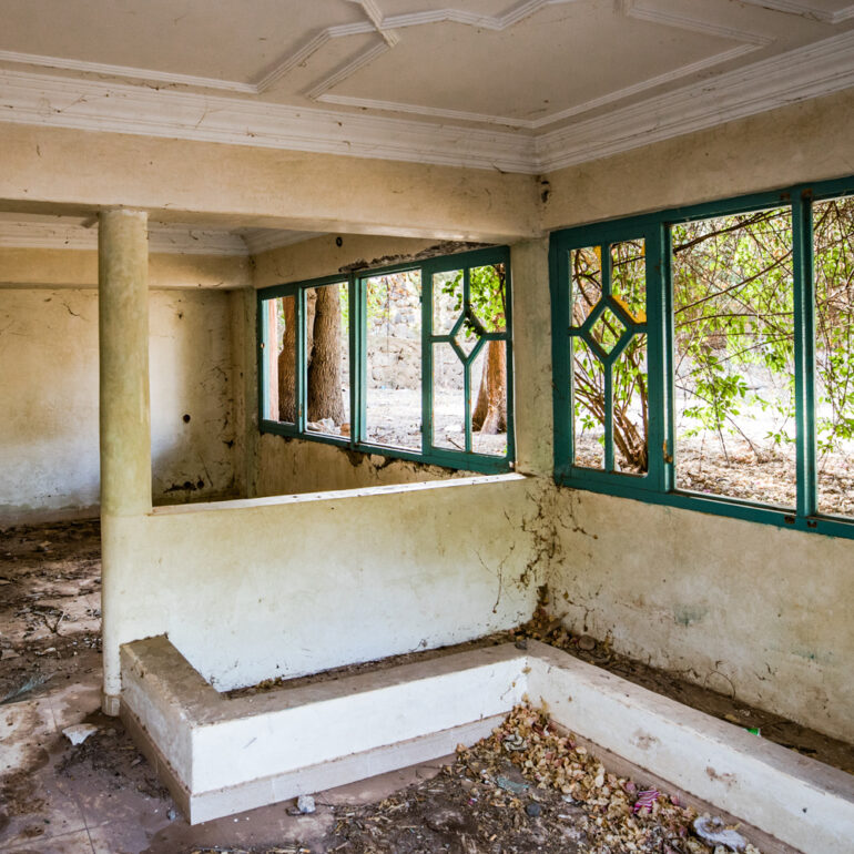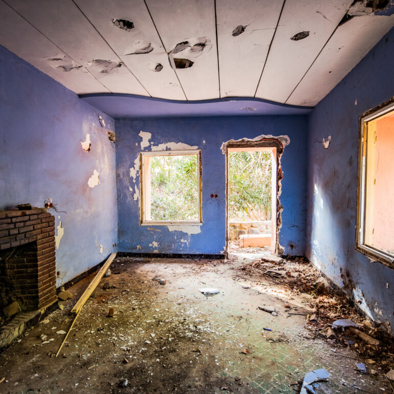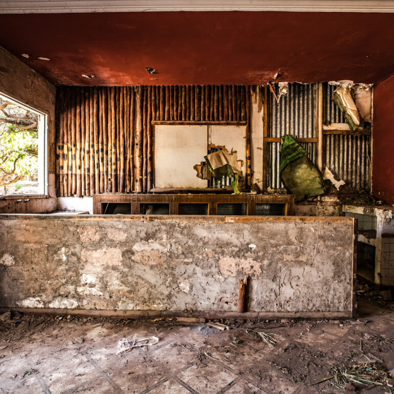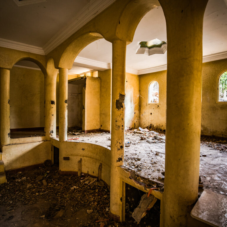 La série qui suit fait partie du projet «Lieux abandonnés» d’urbex, partant à la découverte du Sanglier qui fume, un ancien hôtel situé à 65 km de Marrakech. Le temps là-bas s’est arrêté, pour ne laisser régner que la nature qui reprend ses droits, sur l’ensemble de la vaste propriété, autrefois lieu de rencontre et d’hospitalité. La lumière du jour prend plaisir à éclairer encore ces grandes salles de réception et ces chambres aux salles de bain spacieuses, et à remplir si bien que mal cette piscine grande et profonde, asséchée depuis sûrement de nombreuses années. Le sentiment de reminiscence est omniprésent, avec aussi, une légère tristesse d’observer que l’homme a pu profiter de l’abandon du lieu pour amasser ce qu’il pouvait, des portes, des fenêtres, des câbles, de la robinetterie aux vasques… Seuls demeurent des papiers, par centaines, jonchant le sol comme après une tempête, et des vêtements et couvertures dans des recoins cachés, certainement ceux de vagabonds, trop pressés pour ramasser leurs maigres possessions avant de reprendre leur cavale.»